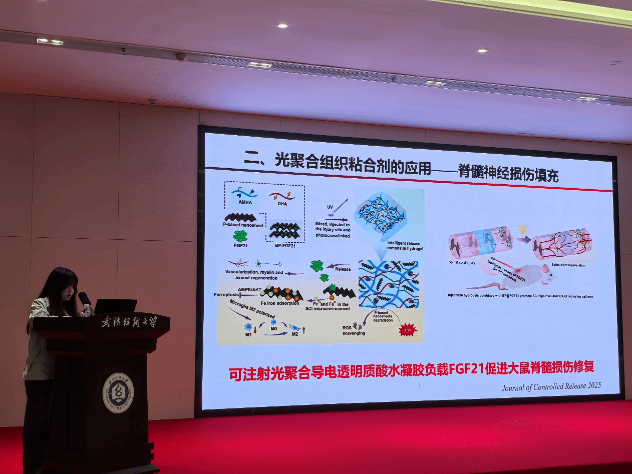 杨一如以“RGD多肽功能化生物材料促进神经再生”为主题展开汇报。她介绍了RGD多肽在生物材料功能化修饰中的应用机制,通过将其与生物材料结合,构建适配神经细胞生长的仿生微环境,为中枢神经系统损伤修复提供了新思路,其研究与当前神经再生医学领域的材料设计趋势高度契合。