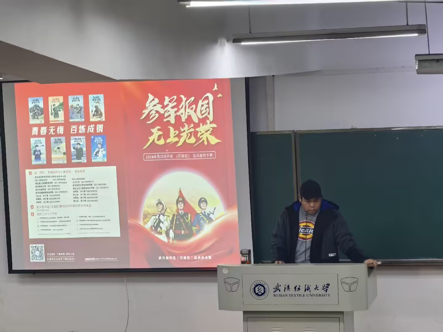 1月23日晚6点-7点,英国正版365于7教T-201开展“携笔从戎砺青春,热血报国正当时”主题班会暨征兵宣传“三个一”活动,本次大会由党委员工工作部、武装部统筹,2023级、2024级、2025级全体同学共同参与,辅导员朱一雷主持会议。