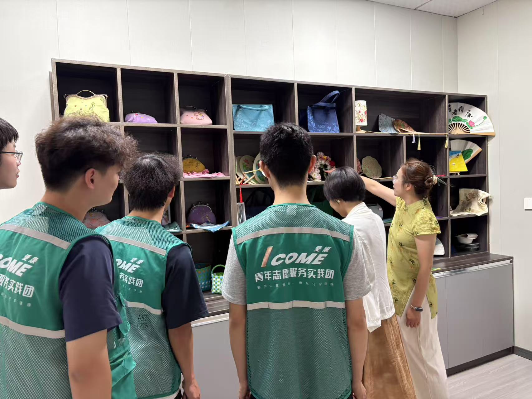 仪式结束后,志愿者与社区居民携手参观社区文化长廊。长廊内陈列的汉绣、扎染等精美手工艺品,均由志愿者与社区居民共同创作完成,飞针走线间传承非遗文化,斑斓色彩中凝聚邻里温情,成为社区一道亮丽的文化风景线。居民们亲身体验手工制作,一针一线间,传统艺术不再是博物馆里的“静态展品”,而是社区生活中“可触摸、可参与”的文化体验。从图案设计到手工实操,居民们在互动中感受非遗魅力,员工也在文化传承实践里,深化对传统文化创新传播的思考,让校社文化交流实现“双向奔赴”。